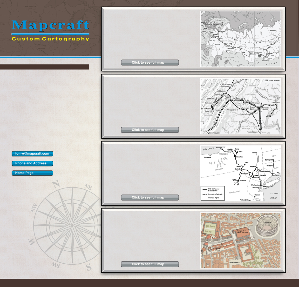 Mapcraft has produced a number of maps for publishers from around the world. The range of published projects includes: campaign maps for brigade histories of the Civil War; route maps for railroad histories; detailed diagrams of Greek temples and other sites; and, perspective views of ancient cities that were used in a high school history atlas.